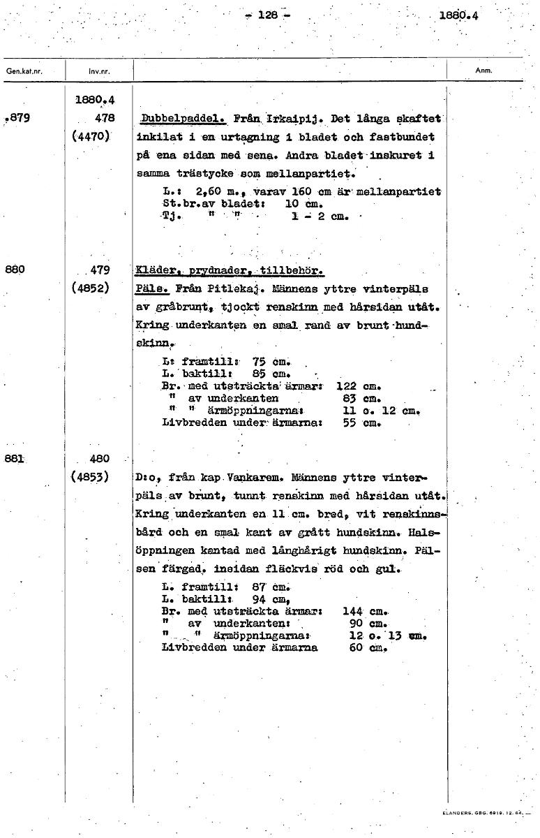128 18E0.4 1880.4 .879 478 Mubbelpaddel. Prån.Irkaipij. Det långa skaftet' (4470): inkilat i an urtagning i bladet och fastbundet på ena sidan med sena. Andra bladet-Inskuret 1 samma trästycke.som mellanpartiet: L.: 2,60 m.9 Varav 160 cm ärmellanpartiet St.br.av bladet: 10 Cm. -Tj.. " 1 «, 2 cm. 880 479 Kläder, prydnader.-tillbehör. (4852) Päls. Från Pitlekaj. Männens yttre vinterpäls av gråbrunt, renskinn med hårsidan utåt. Kring underkanten en smal rand av brunt-hund, L: 75 öm: L.'baktillt 85 cm. Br.. med utsträckt&ärmar: 122 am. " av underkanten 83 cm. fl ärmöppningarnal 11 o. 12 em. Livbredden underärmarna: 55 cm. 881 . 480 <4853) D:o, från kap.Vankarem. MMrånpne yttre vinter- päls:av brunt. tunnt renekinn med hårsidan utåt. Kring underkanten en 11:cm. bredy vit renskinns- bård och en smal kant av grått hundskinn. Hals- öppningen kantad med långbArigt hundskinn. Päl- sen'färgad. insidan fläckvis röd och gul.. L. frattillt Sr öm. L.'baktilla 94 cm, Br. med utsträckta ärmar: 144' cm.. av uuderkanten: 90 cm. — - ."ärmöppningarnaa 12. o..13 at. Livbredden under ärmarna 60' cm. [ocr]Stäng