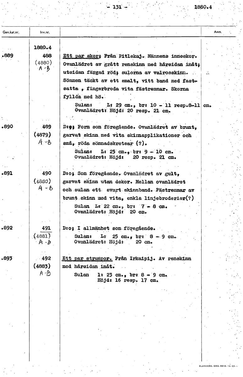 1889.4 1889.4 .889 488 Ett par akork Prån Fitlekaj. Männens inmakar. (4880) Ovanlädret av grått renskinn med hårsidan inåt; A utsidan färgad rödy sulozna av valrosskinn. Sömmen täckt av ett smalt, vit...