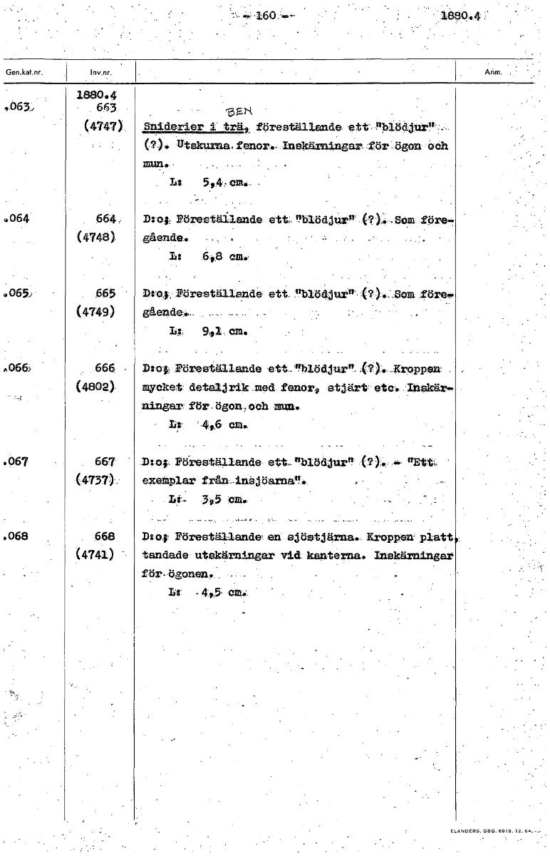 •160 -11880.4 1880.4 *063, 663 3 H. (4747) Sniderier 1 trät, föreställande, ett ndödjut,t•:-. (?). Utskurna. fenor., Inskärningar ;för:,Ögon Och mun., Lt 594, cm. 064 664 D:o; Föreställande ett, "blöd jur" (?)* -Som före- (4748) gående.. L: 698 cm. 65 665 D:04, Föreställande ett .fiblödjurn (?)...Som (4749) gående*. -- as; 911 066) 666 D: alt Föreställande ett- nlödjurn..(?),.-Kroppen . (4802) mycket detaljrik med fenor9 stjärt etc. Inskär- ningax, för. ögon, och mun. 416 om. . 067 667 .D.:'of Föreställande- ett.nblödjurv!',(?). •••= "Ett, (4737) exemplar från-. inej-öarne. 3,5 . 068 668 Ds.o;r Föreställande en.sjöstjärna., Kroppen' platt (4741) tandade utskärningar vid. Icanterna. Inskärningar' för-ögonen.. • La - 4y5 eith; [ocr]