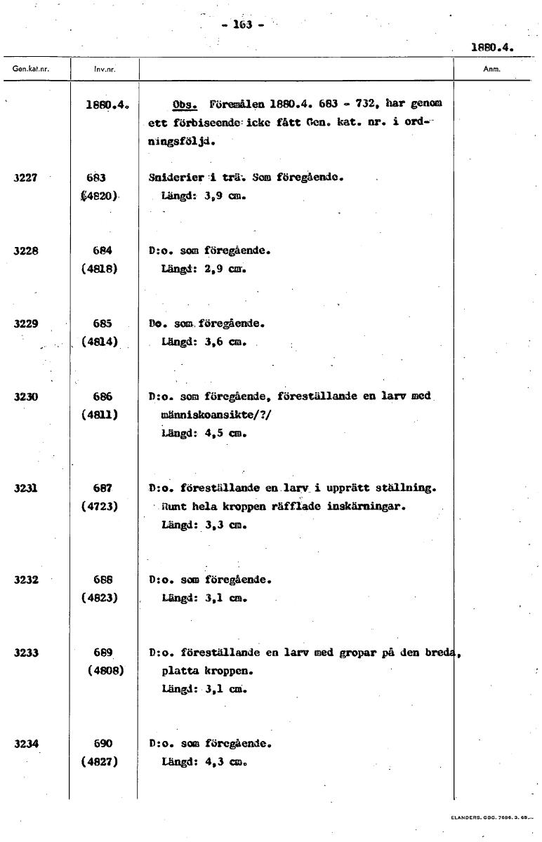 - 163 - 1880.4. 1880.4. Obs. Föremålen 1880.4. 683 - 732, har genom ett förbiseende:icke fått Con. kat. nr. i ord-- ningsföljd. 3227 693 Sniderier:1 trä-. Som föregående. 14820), Längd: 3,9 am. 3228 6...