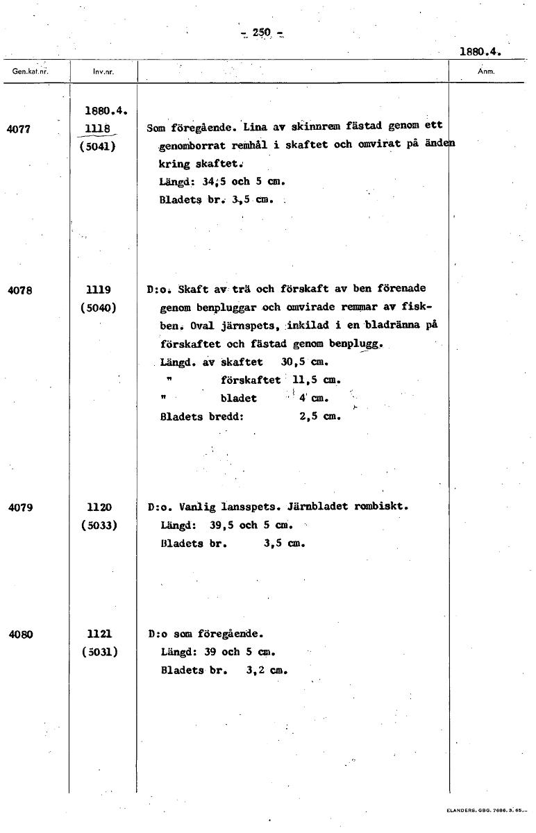 250 1880.4. 1880.4. 4077 1118 Som föregående. Lina av skinnrem fästad genom ett (5041) genomborrat remhål i skaftet och omvirat på änd kring skaftet: Längd: 34;5 och 5 cm. Bladets br. 3,5 cm. 4078 111...Visa hela