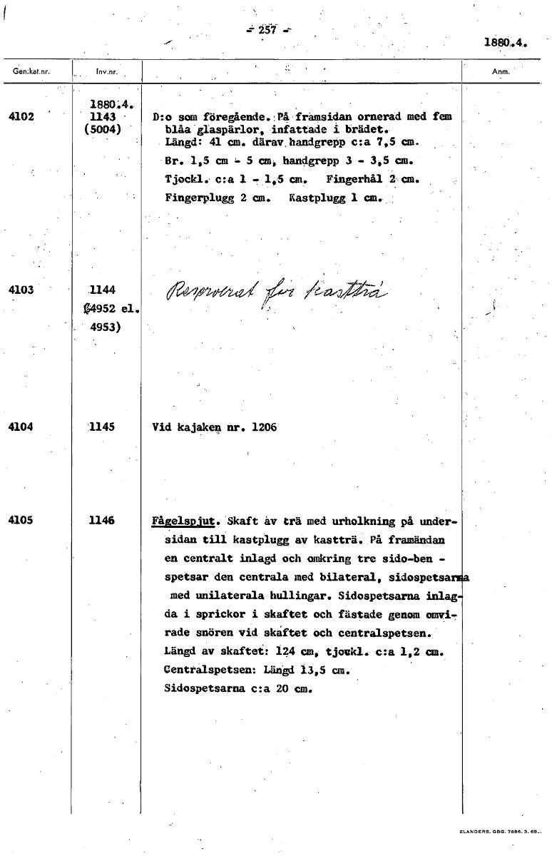 -+ 251 1860.4. 1880.4. 4102 1143 • D:o som föregående. På framsidan ornerad med fem (5004) blåa glaspärlor, infattade i brädet. Längd: 41 cm. därav handgrepp c:a 7,5 cm. Br. 1,5 cm - 5 cm, handgrepp 3 - 3,5 cm. Tjockis c:a 1 - 1,5 cm. Fingerhål 2 an. Fingerplugg 2 cm. Kastplugg 1 cm. 4103 1144 (71-år"d 64952 el. 4953) 4104 1145 Vid kajaken nr. 1206 4105 1146 Fågelspjut. Skaft av trä med urholkning på under- sidan till kastplugg av kastträ. På framändan en centralt inlagd och omkring tre sido-ben - spetsar den centrala med bilateral, sidospetsa med unilaterala hullingar. Sidospetsarna inlag da i sprickor i skaftet och fästade genom omvi- rade snören vid skaftet och centralspetsen. Längd av skaftet: 124 cm, tjoukl. c:a 1,2 cm. Centralspetsen: Längd 13,5 cm. Sidospetsarna c:a 20 cm. [ocr]