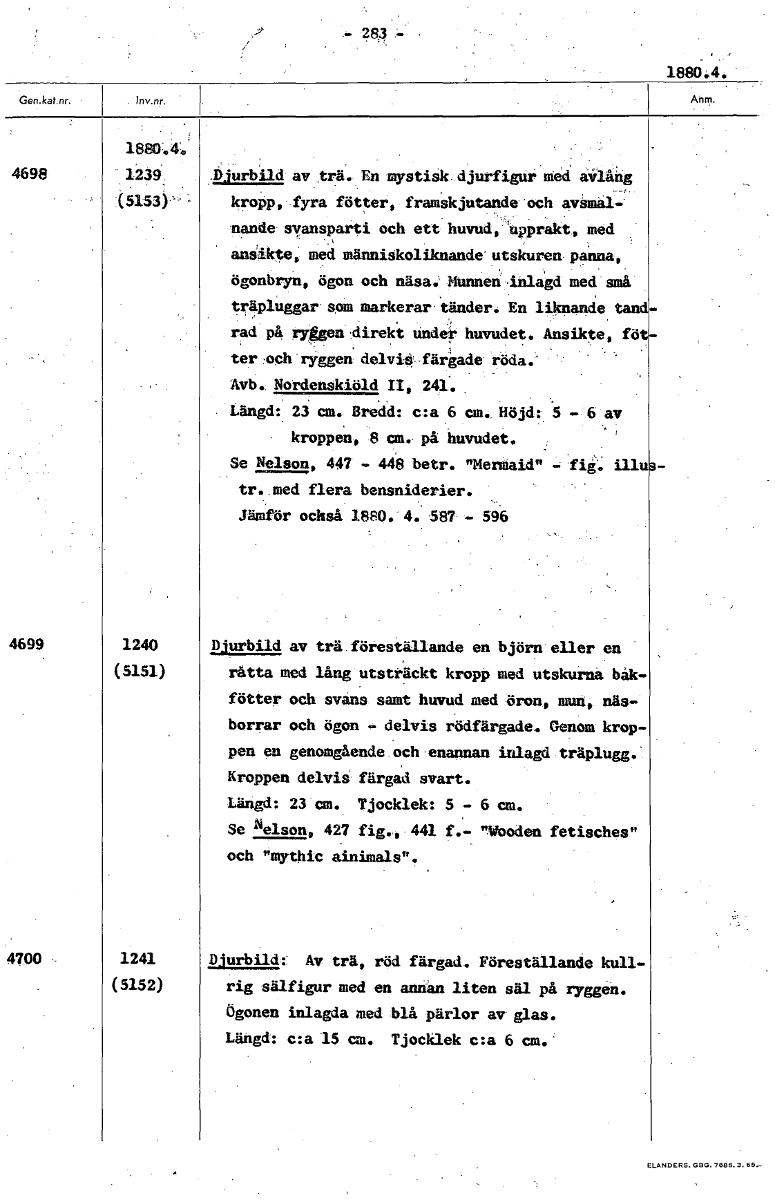 28:3 1880.4. 1880..4. 4698 1.239, Djurbild av trä. En mystisk djurfigur med wilång 5153) kropp, fyra fötter, framskjutande och avsmal- nande syansparti och ett huvud, 'upprakt, med arcAikte, med männi...