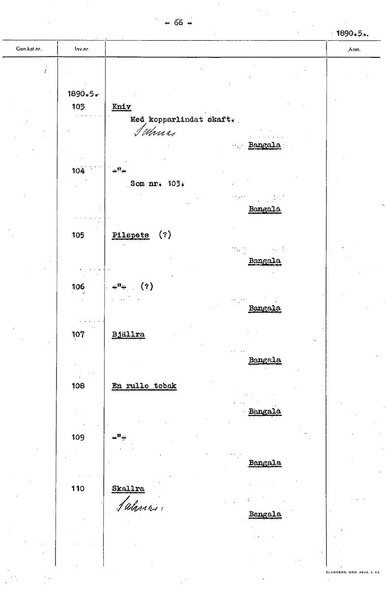 • 66 - 189005.. 169095., 103 Kniv. Med kopparlindat Skaft., angalal 104 Som nri 1034, Bangala 105 Pilspets (?) Bangala 106 (?) 101 Bjällra Bangala 108 En rulle_tobak Bangala 109 Bangala 110 Skallra 444 ... Visa hela