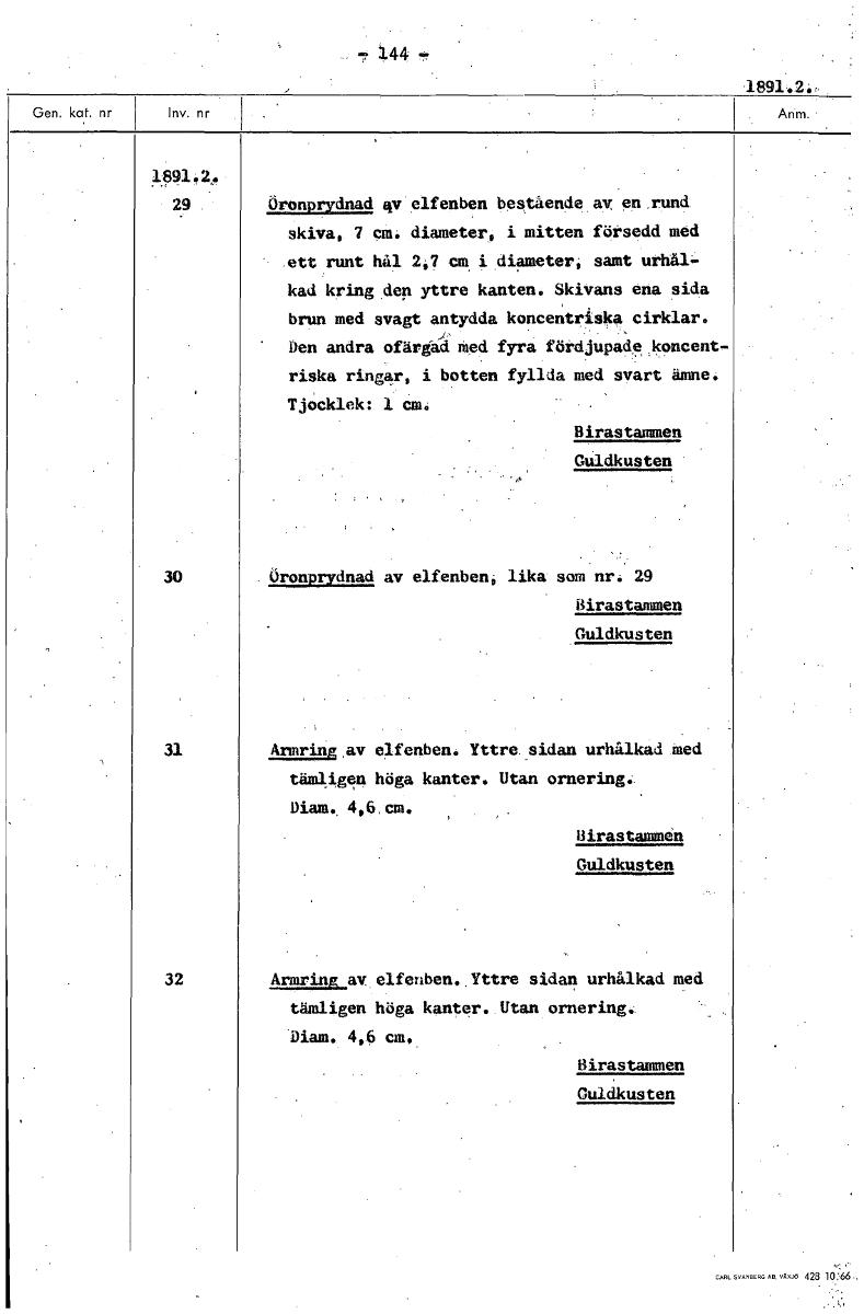 144 1891424. 1691.2. 29 Öronprydnad qv elfenben bestående av en rund skiva, 7 cm. diameter, i mitten försedd med ett runt hål 2,7 cm i diameter, samt urhål- kad kring den yttre kanten. Skivans ena sida brun med svagt antydda koncentriska cirklar. Den andra ofärgad med fyra fördjupade koncent- riska ringar, i botten fyllda med svart ämne. Tjocklek: 1 cm. Birastammen Guldkusten Öroprydnad av elfenben lika som nr. 29 Birastammen Guldkusten 31 Armring av elfenben. Yttre sidan urhålkad med tämligen höga kanter. Utan ornering. Diam. 4,6 cm. BirastamMån Guldkusten 32 Armring av elfenben. Yttre sidan urhålkad med tämligen höga kanter. Utan ornering. in" 4,6 cm. Birastammen Guldkusten [ocr]
