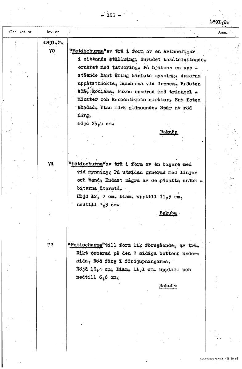= .155 1891;g4 • 1891 e 2e 70 1YPetieehurna"av trå i korm av en kvinnof4.gur. i Sittande åtällninge Huvudet bakAtel4ttande ornerat mod tatuering,. På hjässan en upp - stående kant kring kärXeta mynning ,:i Armarna uPP4tatritOkta9 händerna• vid öronen. Brösten Bukervernered med triangel 1, Mönster och koncentriska oirklar:ik Ena foten skadad, Ytan mörk glänsandeS Spår av röd färgs. nöjd 255 ene • Bakub a 71 Ö.Petedhurnanav tri i färm av en bägare ...Med Vid mynning På uteidan ornerad -mod linjer Och band. Endast några av de påsatta enåek bitarnaåterståe Höjd 129 7 dm. Diam upptill 11r5 eM4,. nedtill 743 om... Baltnba. "PetieohurnOti11 ferm lik föregående- av trä. Rikt 'ornerad på den 7 eldiga 'bottens under.s. sida., Röd färg 1 fördjupningarnas' nöjd 1394 oms Diåme 1191 oms upptill och nedtill 696 cm. Beknipa [ocr]Stäng