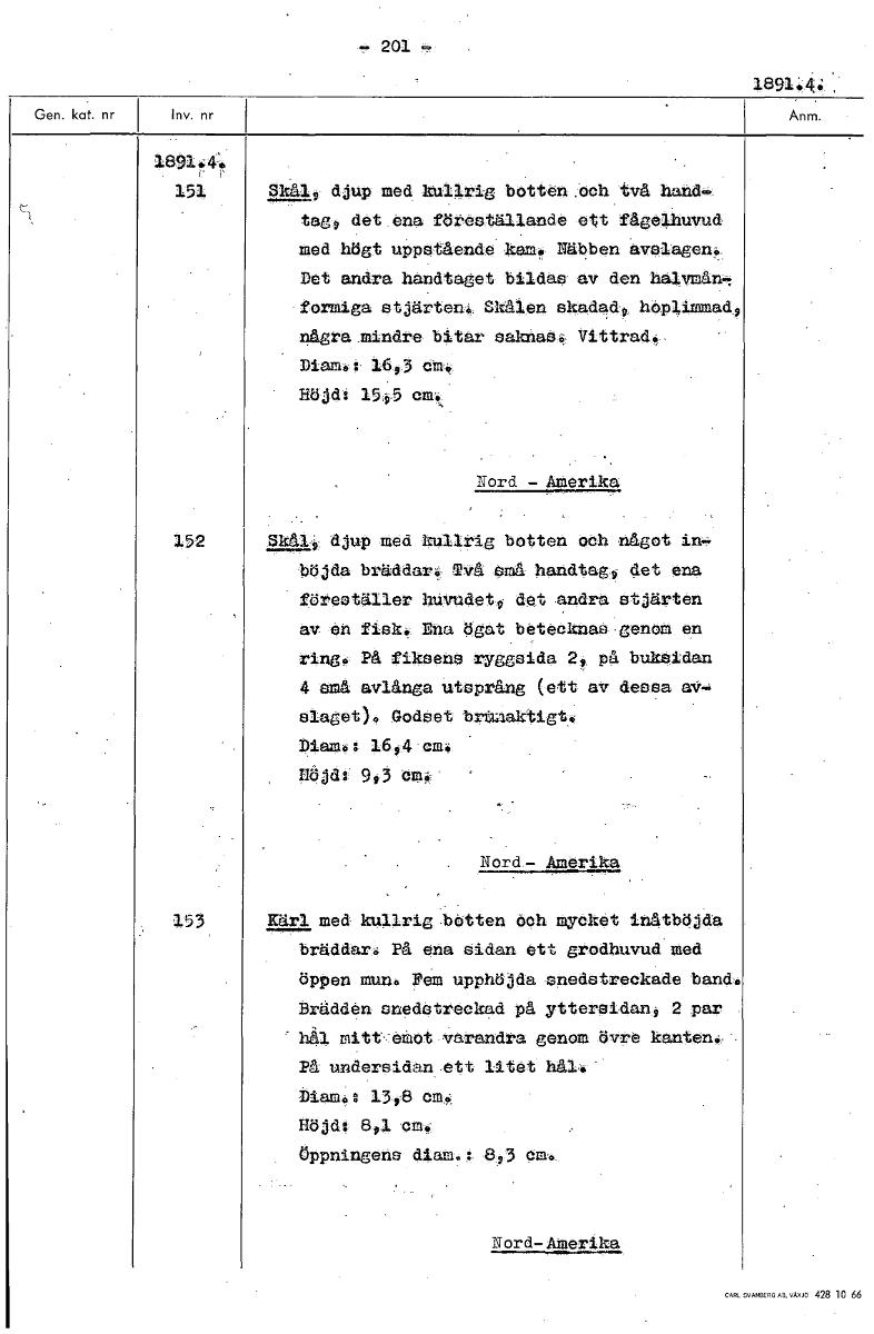 201. 1891.44; 151 Skål, djup med kullrig botten och två hand. tag, det ena föreställande ett fågelhuvud med högt uppstående kam. Näbben avslagen.. Det andra handtaget bildas av den halvmånformiga stjärten. Skålen skadad hoplimmad, några mindre bitar saknas. Vittrad. Diam.: 163 cm. Höjd: 15,5 om, Nord Amerika 152 Skål, djup med kullrig botten oeh något in böjda bräddar. Två små handtag, det ena föreställer huvudetp det andra stjärten av en fisk.. Ena ögat betecknas genom en ring. På fiksens •ryggsida 2, buksidan 4 små avlånga utsprång (ett av dessa av. slaget). Godset brilmaktigt. Diam: 16,4 cm. Höjd: 9,3 cm. Nord. Amerika 153 Kärl med kullrig botten Och mycket inåtböjda bräddar. På ena sidan ett grodhuvud med öppen mune pem upphöjda enedstreckade band. Brädden snedstreekad på yttersidan, 2 par hål mitt-.-elhot varandra genom övre kanten...-. På undersidan ett litet hål4 Diam.: 13,8 0114 Höjd: 8,1 eni. öppningens diam.: 8,3 Nord-Amerika [ocr]