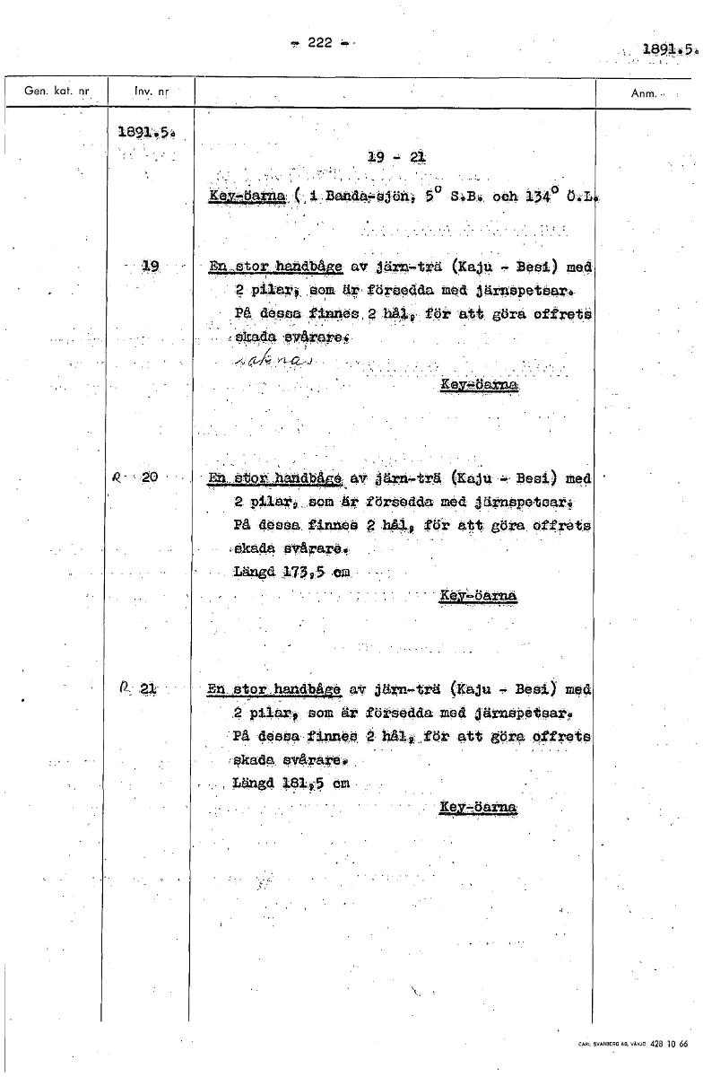 222 1891•5å En.star handbåg av järn-trä (Kanu Egal) med 2 pilar,, gom tk,försaddo, mad, järgapetaaro På dessa :ingas, 41.0 för att göra offret ; *trad k- 20 I. ;star; <haadbs riv trä (Kaju = 13esi) med 2 glarp .som r föraadda med järnspeteark På dasaa finnes ? h4p Or att göra oft'rats ,skada svårare.: Längd 17395 om Kayöarna, En stor.handb1/42 av järn-trä (Kaju Basi) med 2 pilarp som är försedda med järnapatsar5, På 4.gega tinne* 2 Båi töt att göra agfrats skada ayårareo, Längd 4.4345 am Kay-töarna [ocr]