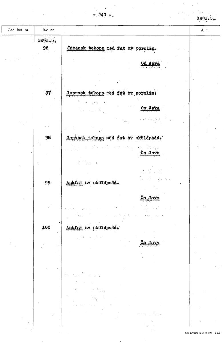 • 240 1891. 1891, 5 96. jatanek tellgtwe nod fat av porslin. t5.21„jska 7 Japansk tekopp me tat av porslin. Ön Java: 98 Japansk .teköpp mete kat av sköldpad4.1 öwJava 99 Askfat av sköld.padt.i. ön Java ... Visa hela