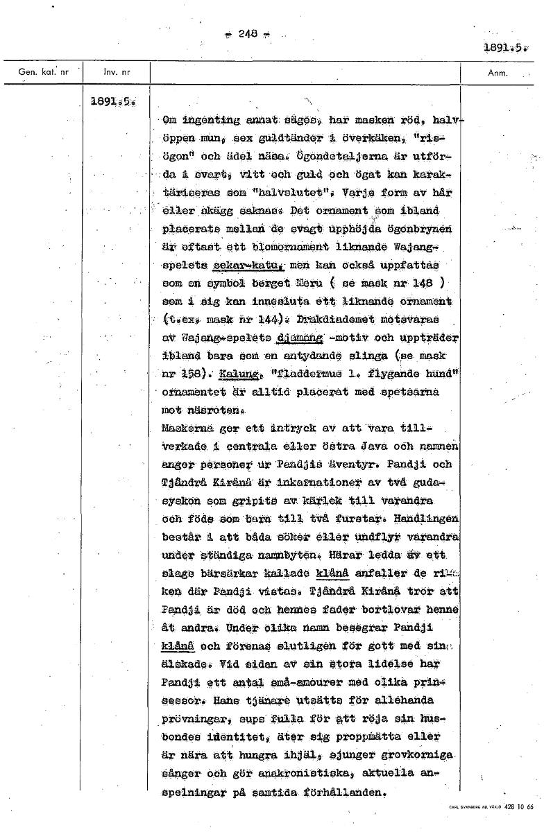 24€3 •. 1$92454, Qm ingenting annat. stigos si har maskett xts44 halv öppen-fano eez galdtändet i öVetkäkeno. "tis-; ögon" öeh ädel nägg‘ dgendetaljerna är utför.- da i svart O vitt 'oh .guld 00h -ögat kan karak- täriseras dom nhalveiutetn4 Varje form av hår eller.Skägg saknas Det ornament som ibland • placerats mellan 'do g4tet, upphöjda ösönbtynön är O'ftast, ett 151,:omornnment liknande waJang, -speletä gekarikkatUo- men kan också uppfattas son en synfiol berget 'Metu ( de task nr, 148 ) sem i sig kan, infleslUta ett liknande ornament • (te2h.k' mask nr 144» diademet mOtdVarad av WaJangmk.speldts jällAggka. -motiv och uppträder ibland bara som en antydande slinga (Se mask nr 158)..' Kalung,, "fladdermUd I. flygande hundt, ornamentet åt alltid placerat med spetsarna mot näStöten Magkerna ger ett intrrok av att 'vara till- Verkade i centrala eller östra Java odh namnen 'mast Personer ur 'Pandå id äventyr. Pandji och TyAndr4 'titan& är Inkatnationet av tv4 guda,-; sYsken som gripits av, kärlek till vatandra och föds Sem 'tjata till två furstat4 Hand ingen består 1 att båda söker eller undflyr varandra under StiAndiga nafnbYtenk Rätat -ladda-ä' att slags bäryr kallade klånå anfallet de 11.141 kelt där Pandji vldtaso TJåndtå Kirång, tror att Pandj1 är död och hennes fader bortlovar henne åt andrai Under blika namn bedegtat Pandji klånå och förenas slutligen för gott med sin älskade Vid sidan av din stora lidelsd hat Pandji ett antal dm4-ameater med olika Prih4 dedectil, Hans tjänare utsätts föt, allehanda prövningars sups' -rulla för ?,tt töja gin hge- tiond9e identitet, äter sig ProPPfätta elldt är näta att hungra sjunger grovkotniga- sånget och gör anakronistiska, aktuella an- spelningar på samtida förhållanden. [ocr]