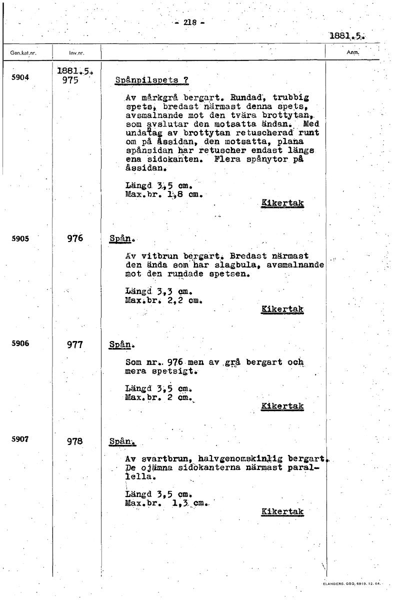 218 - 1881 5904 975 Spånpilspets ? Av mårkgrå bergart. Rundad', trubbig spets, bredast närmast denna spets, avsmalnande mot den tvära brottytan, som avslutar den motsatta ändan. Med undatag av brottytan retuscherad runt om på åssidan, den motsatta, plana spånsidan har retuscher endast längs ena sidokanten. Flera spånytor på åssidan. Längd. 3,45 cm. Max.br. 48 cm. ........ Likertak 5905 976 Spån. Av vitbrun bergart. Bredast närmast den ända som har slagbula, avsmalnande Mot• den rundade spetsen. Längd 3,3 cm. Max.br, 2 2 cm. Kikertak 5906 977 Som nr.. 976 men av grå bergart och mera spetsigt. Längd 3,5 cm. Max.br. 2 cm. Kikertak 5907 978 Av svartbrun, halvgenomskinlig bergart De ojämna sidökanterna närmast paral- lella. Längd 3,5 cm. Max.br. Kikartak [ocr]