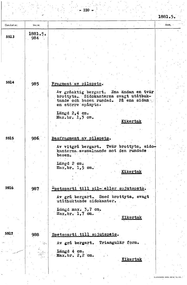 220 - 1881.5. 1881.5. 5913 984 5914 985 Pragment av pilspets. Av gråaktig bergart Ena ändan en tvär brottyta.. Sidokanterna svagt utåtbuk- tande och basen rundad. På ena sidan.-_ en större spänyta. Längd 2,4 cm. Max.br. 1 3 vm. Kik 5915 986. kleUen.0.--se" • AV vitgrå bergart. Tvär brottyta, sido: kanterna..,. avsmalnande möt den rundade. basen-4 ' Längd. 2 vm: Max.br. 1,5 em.- Kikertak 5916 987 det. s Av-grå,bergart. Sned brottyta, svagt utåtbUktande sidokanter. : Längd max. 3,7 cm. Max.br.' 1,7 cm. Kk 5917. 988 S ets Av grå bergart. Triangulär form. Längd 4 cm. Max.br. 2,2 cm. Kikertak [ocr]