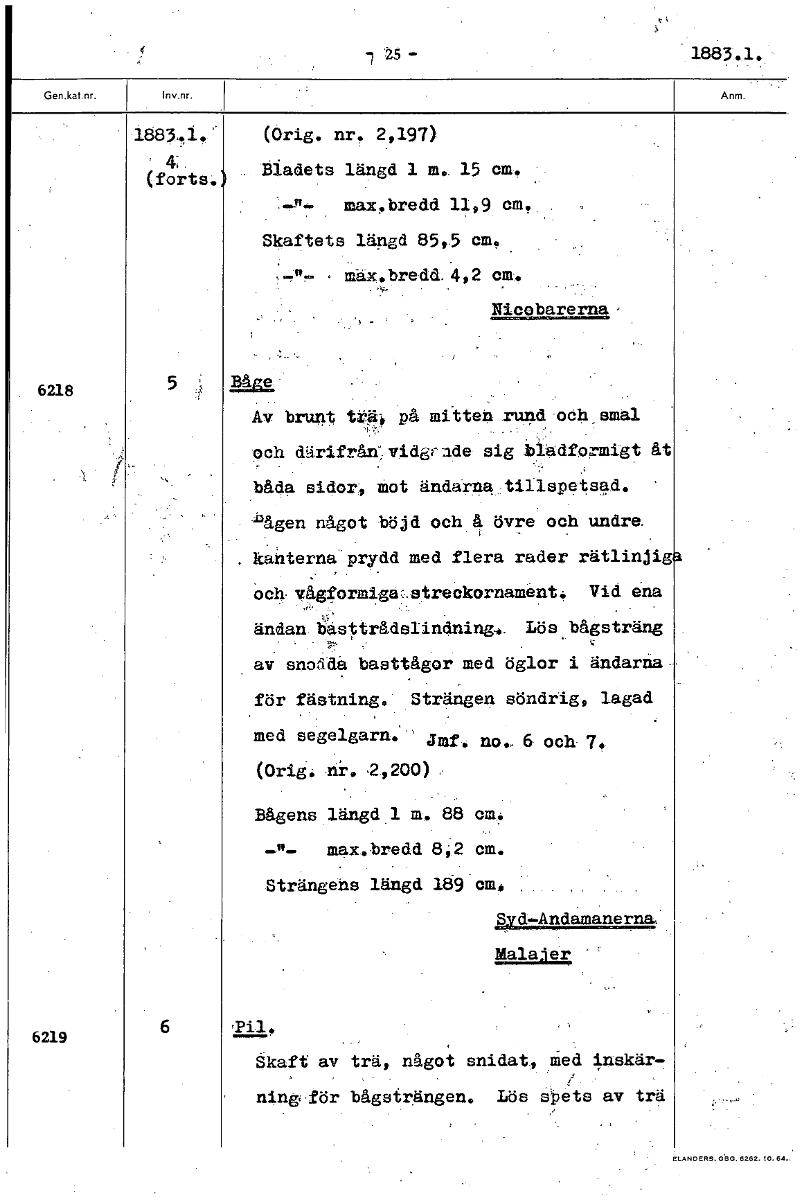 7 '25 - 1883.1. 18834. (Orig. nr. 2,197) 4. (forts- Bladets längd 1 m.. 15 cm. max.bredd 11,9 cm. Skaftets längd 85,5 cm,. mälc.bredd.4,2 cm. Nicobarerna 6218 Båge Av brunt trä, på mitten rund och, sm...