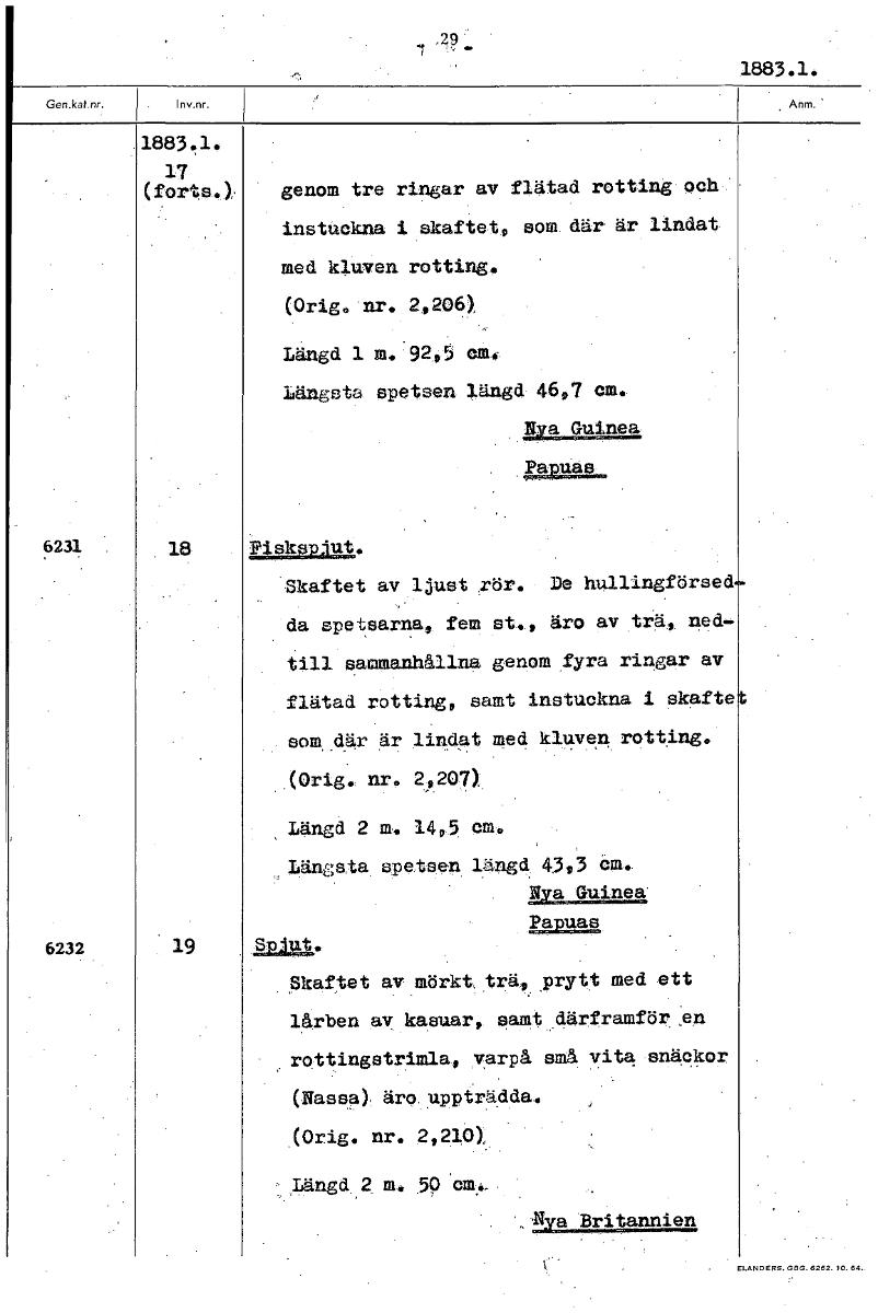 1883.1. 1883.1. 17 (forts.); genom tre ringar av flätad rotting och instuckna i skaftet, som där är lindat med kluven rotting. (Orig. nr. 2,206) Längd 1 m.92,5 em. Längsta spetsen längd 46,7 cm. Nya G...