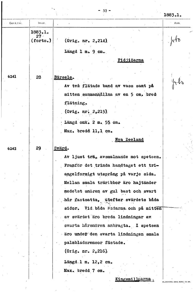 - 33 - 1883.1. 1s83.1. 27' (forts.) (Orig. nr. 2,214 Längd 1 9 cm.. Pidjiöarna 6241. 28 Bärsele., Av två flätade band av vass samt på mitten sammanhållna av en 5 em. 1bred flätning. (Orig. nrk,2.215),...