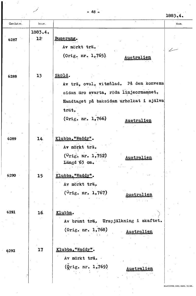 - 48 1885.4,- 1883.4. 6287 12' Bumerang. Av mörkt trä. (Orig. nr. 4765). Australien 6288 13 Sköld. Av trä, oval, vitmålad. På den konvexa sidan äro svarta, röda linjeornamnet. Handtaget på baksidan ur...