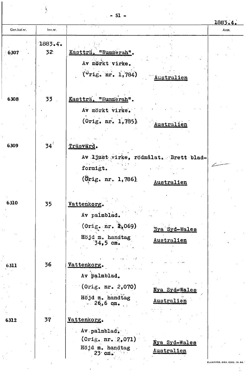- 51 - 1883.4. .6397 32 Kastträ. nummerah". Av mörkt virke. Vrig. nr. 1,784) - Australien 6308 33 Kastträ "Wumme'rah". Av mörkt vir'ke. (Orig, nr. 10785)1 Australien 6309 34 Träsvärd. Av ljut virke, r...