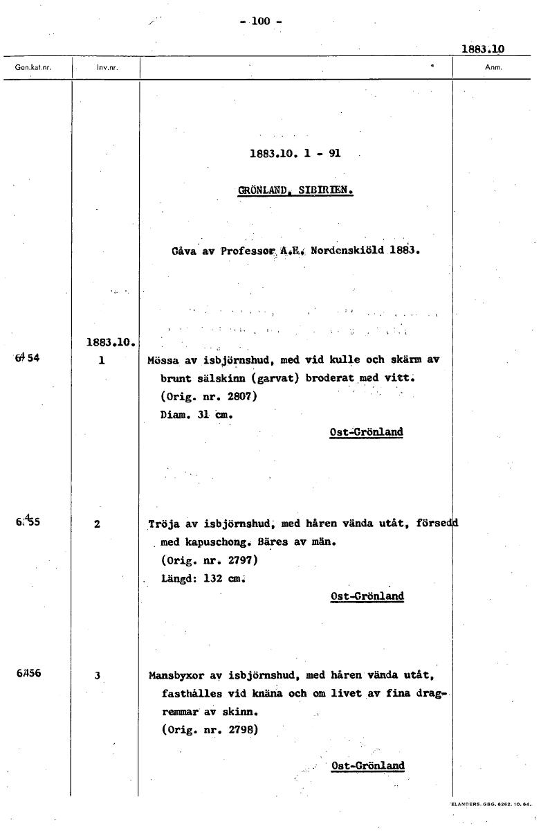 1883.10 1883.10. 1 - 91 GRÖNLAND SIBIRIEN. Gåva av Professor:, Nordenskiöld 1883. 1883.10. 6454 1 Mössa av isbjörnshud, med vid kulle och skärm av brunt sälskinn (garvat) broderat med vitt. (Orig. nr. 2807) Diam. 31 am. Ost-Grönland 6:455 2 Tröja av isbjörnshud, med håren vända utåt, förse med kapuschong. Bäres av män. (Orig. nr. 2797) . Längd: 132 cm. Ost-Grönland 6456 Mansbyxor av isbjörnshud, med håren vända utåt, fasthålles vid knäna och om livet av fina drag- remmar av skinn. (Orig. nr. 2798) Ost-Grönland [ocr]Stäng
