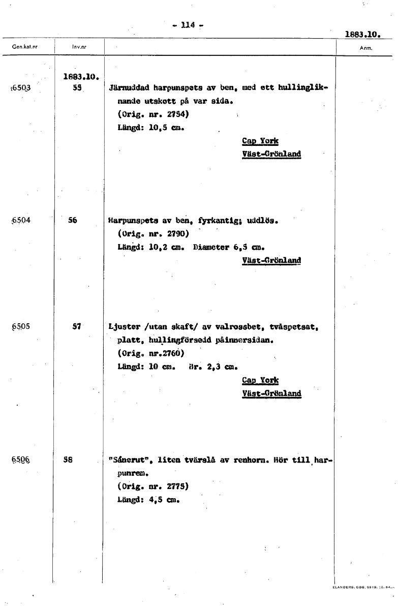• - 1.14 1883.10. 1883.10. 16503 55. Järnuddad harpunspets av ben, med ett hullinglik- nande utskott på var sida. (Orig. nr. 2754) Längd: 10,5 cm. Cap York Väst-Orönland 004 56 Harpunspets av ben, fyrka... Visa hela