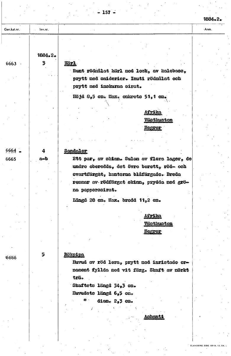 - 157 - 1884424 1884424. 6663 • 3 Bärl • Runt i43-&aå1atkar3. med lock, av kalebass, prytt med eniderier4 Inuti rödmålat och prytt med inskurna sirat. Böjd 815 caEage, ~te 5111 Afrika Västkasten Ire.Trer §§§4 - 4 Sandaler 6665 a-b Ett par, av skinn4 %1e av flera lager, de undre °beredda, det övre berett, röd- och svartfärgat, kanterna blätfärgadeo, Breda remmar av.rödförgat ki px7dda med gr- nu papperesirat.. Längd 28 wo Max.* bredd 11,2 ca. Afrika Västkuoterk genrer (6666 5 Rökpipa Huvud av röd lera, prytt med inristade or.» nament fyllda Med vit färg. Skaft av rgirkt Wel* Skat tets längd 34,3 en. Huvudets längd 6,5 °åh. 2,3 cm. • Ashautt [ocr]