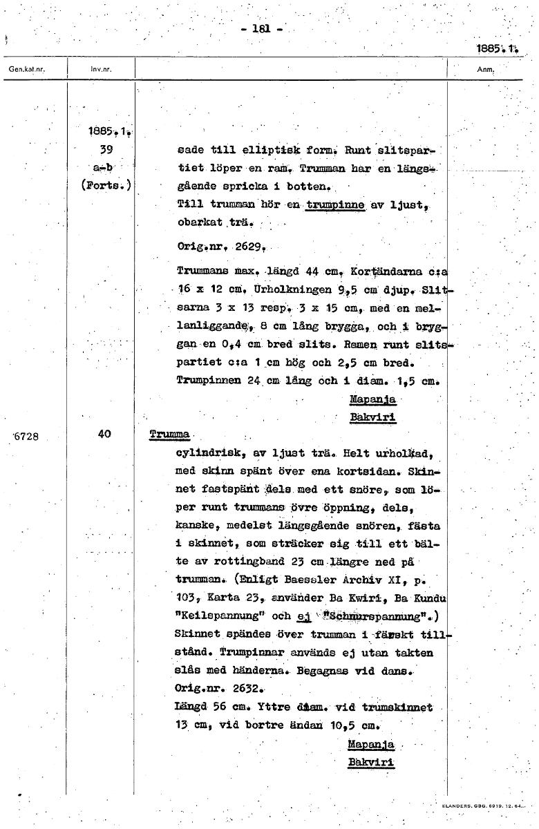 • 1865:1: 18435 ',tv 39 till elliptisk form, Runt slitspartiet löper en ram. Trumman har en längsgående spricka i botten. Till trumman hör en trumpinne av ljust, obarkat ,trä. Orig:nr, 2629. Trummans Max. längd 44 cm. kortfändarna 16 x 12 cm, Urholkningen 9,95 cm djup. Slitsarna 3 x 13 resp:. 3 x 15 cm., med en mellanliggande 8 cm lång brygga, och en 0,4 cm bred slits. Ramen runt slitspartiet ca 1 cm hög och 2,5 cm bred. Trumpinnen 24.cm lång och i diam. 1,5 cm. Mapanja Bakviri. 40 Trummema. cylindrisk, av ljust trä. Helt urholkad, med skinn spänt över ena kortsidan. Skin- net fastspänt kale. med ett snöre,, som lö- per runt trummans övre öppning, dels, kanske, medelst längsgående snören,, fästa i sk:innet, som sträcker sig till ett bäl- te av rottingband 23 cm-längre ned på trumman. (Enligt Baessler Archiv XI, p. .1039 Karta 23, använder Ba Kwiri, Ba Kundu "Keilspannung" oCh e Y6ähnixrepannung".) Skinnet spändes över trumman i-färskt till stånd. Trumpinnar används ej utan takten slås med händerna. Bhgagnas vid dans. Orig.nr. 2632. Längd 56 cm. Yttre. &tam. vid trumskinnet 13 Cm vid bortre ändan 10,5 cm. Mapan:la Bäkviri [ocr]