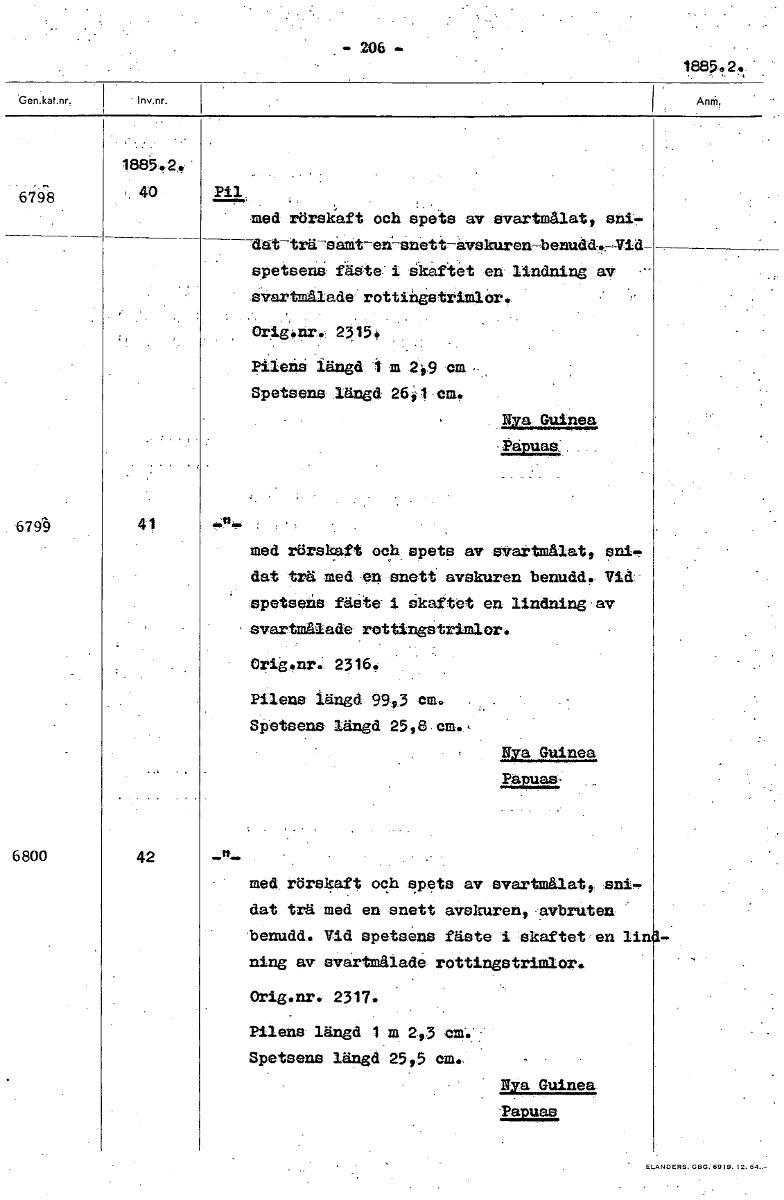 - 206 1885.2. 1885.2. 6798 40 Pil ned rörskaft och spets av svartmålat, s14- dat trä saMt-eri-Snett-avskuren-benudd.-Vid spetsens:. fååte:i Skaftet en lindning av • Svartmålade:rottifigettimlor. Orighnr. 2315. Pilens längd Å m 2119 cm Spetsens längd- 260-cm. • Nya Guinea • Papuas 679'§ 41 med rörskaft och spets av sVartmålat, dat trä med-en snett avskuren benudd. Vid spetsens fäste i skaftet en lindning av svartmålade rottingStrimlor. Orig.nr:. 2316. Pilens längd 99,3 cm. Spetsens längd 25,8 em., Nya Guinea Palmas 6800 42 med rörskaft och spets av svartmålat, dat trä med en snett avskuren, -avbruten benudd. Vid spetsens fäste i skaftet en lin ning av svartmålade rottingstrimlor. Orig.nr. 2317. Pilens längd 1 m 2,3 cm:.: Spetsens längd 25,5 cm. Nya Guinea Papuas [ocr]