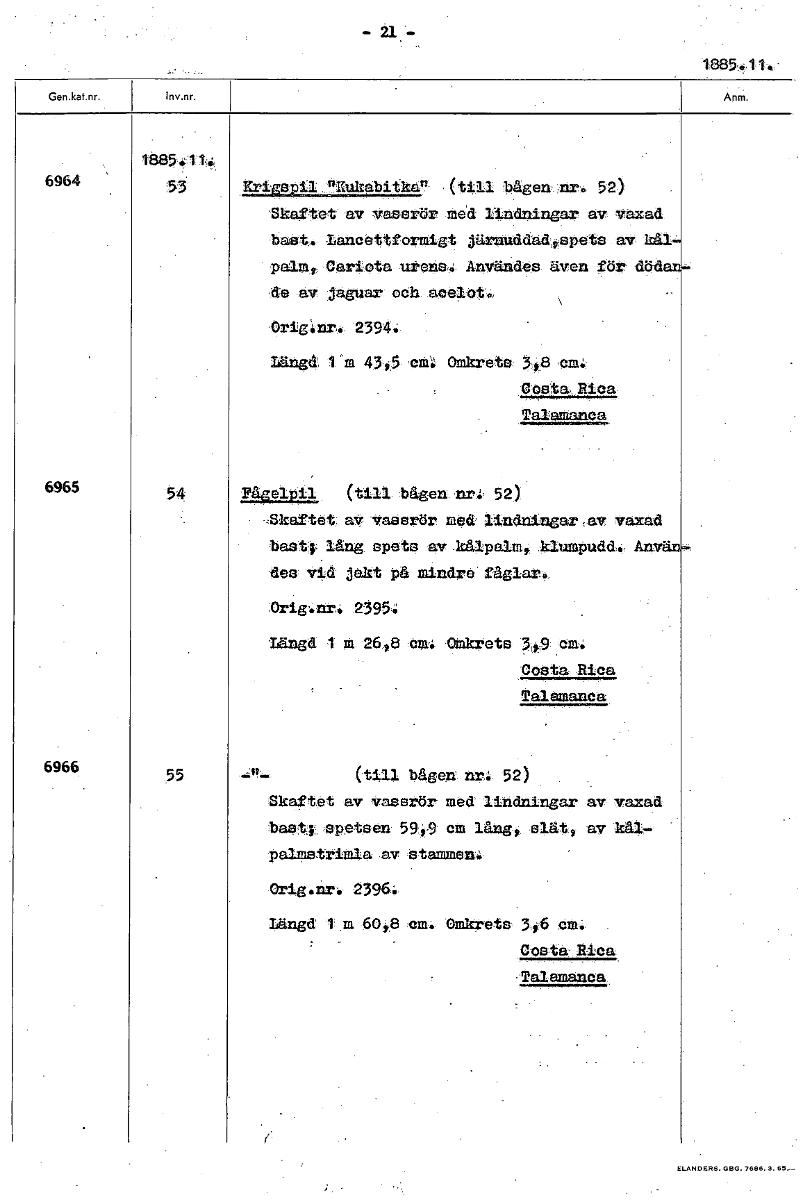 21 1885.11. 11385,0'4, 6964 "Kukabitkan (till bågen nr. 52) Skaftet av vassrör med linaningar av vaxad bast. Lancettformigt järztuddadspets av kål palm, Cariota urens. Användes även för död de av jaguar och acelot. Orid.nr. 2394. längd im 43,5 em: Omkrets 3,8 cm Costa Rica Talamanca 54 IPåselpil (till bågen nr 52) Skaftet av Vassrör med. lindningar,av murad bas4 lång: spets av .101palmi .klumpuda.: AnVI des vid jakt på mindre fåglar., 23954 Länd 1 m 26,8 cm: Omkrets 549-cm. Costa Rica Talamanca 55 (till bågen nr. 52) Skaftet av vassrör med lindningar av vaxad basti spetsen 5949 cm lArgt slätt av kåim- peamstriala av Stammen Orig•iar. 2396: Längd I' m 60t8 cm: ets 346 cm. Costa- Rica Talemanca [ocr]