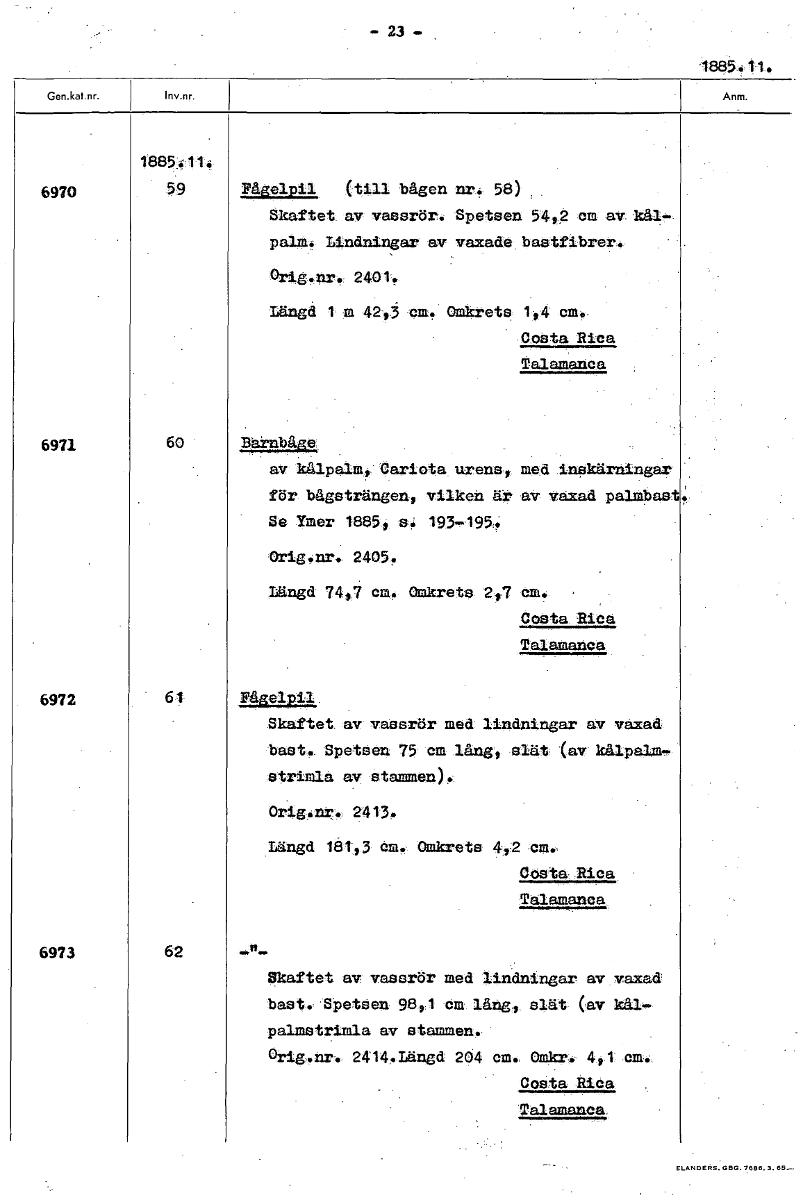 -23- 1885. 11. 1885.:i Ii 6970 59 Fågelpil (till bågen nr. 58) Skaftet av vassrör. Spetsen 5412 cm avkål,. palm. Lindnlngar av vaxade ,bastfibrer. Orig.nr. 2401. Längd 1 in 42-9.t cm. Omkrets 1,4 cm. Costa Rica Talmnianca 6971 60 Barnbåge av kålPaImp Cariota urens, med inskärningar för bågsträngen„ vilken är av vaxad palmbast Se Ymer 1885, e: 193-195: Orig.nr. 2405. Längd 74,7 cm. Omkrets 2,7 om. Costa Rica Talamanca 6972 61 Pågelpll. Skaftet av vassrör med lindvingar av vaxad bast. Spetsen 75 cm lång, slät. (av kålpalm- strimla av stammen). Orig. nr. 2413. Längd 18123 em. Omkrets 4,2 om., Costa: Rica Talamanca 6973 62 Skaftet av vassrör med lindningar av vaxad bast. Spetsen 98,1 cm lång,. slät (av kål - palmstrImla av stammen. crig.nr. 2414.Längd 204 cm. Omkr. 4,1 em: Costa Rica Talamaams [ocr]