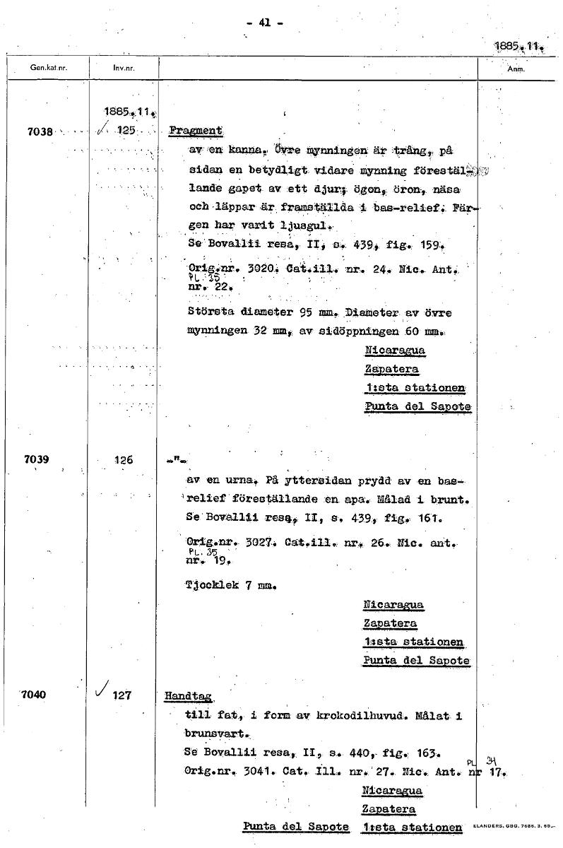 - 41 - 1985.K.1 1885,11.; Pragment, av en kannagövre Mynningen är ,ttångy På sidan en betydligt, vidare mynning förestäl, lande gapet av ett djur+ ögon,, ron4 näsa och ,läppar är, framställda t bas-relief:: _ Pär gen har varit 1jusgul.,. Se:Bovallii resa, II, s. 4394 fig. 159. 30204 Ca.il1 nr. 24. Nie. Ant., nr.- 22. Största diameter 95 mm. _Diameter av övre mynningen 32 mm,; av sidöppningen 60 mm. Nicaragua Zapatera 1:sta stationen. Punta del Sapote 7039 126 av en urna. På yttersidan prydd av en bas- 'relief föreställande en apa. Ml ad i brunt. Se.' Bovailti res% II, S. 4394 fig. 161. Crig.nr.. " 3027. Cat,i11.- nr, 26 Nie. ant. PL.35 nr. 19. Tjocklek 7 mm. Nicaragua Zapatera lasta stationen Punta del Sap.22. 7040 127 Handtag till fat4 i form av krokodilhuvud. Målat' i brunsvart, Se Bovallii resa4 114 s. 440r fig, 163. 3A Origenr. 3041. Cat. nr, 27.. Nie'.; Ant. n 17. Nicaragua Zapatera Punta del Sapote, lista stationen [ocr]