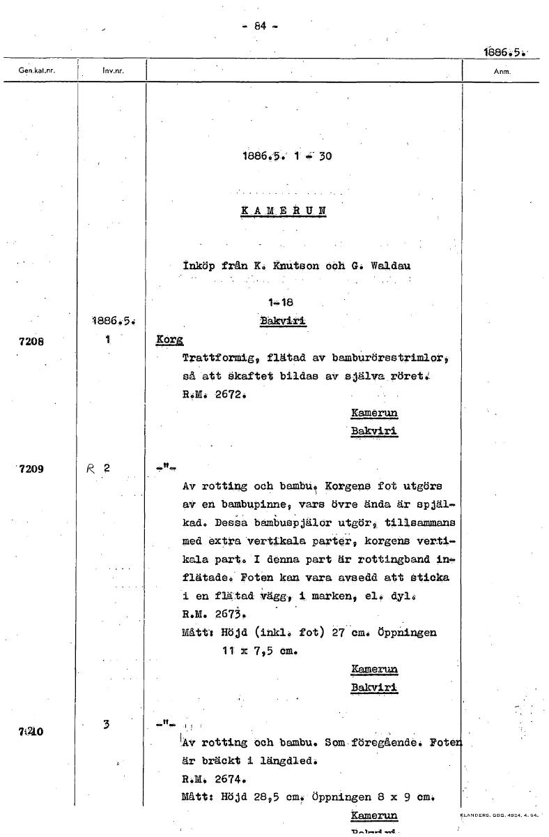-84- 1886450. 1886.5.' 1 ,;; 30 KAMERUN Inköp frän K. Knutson Oh G. Waldau . - 1-18 1886054 Makviti 7208 1 Kona Trattformig, flätad av bambUrörsstrimlor, så att Skaftet bildas av själva röret,■. RMs 2...