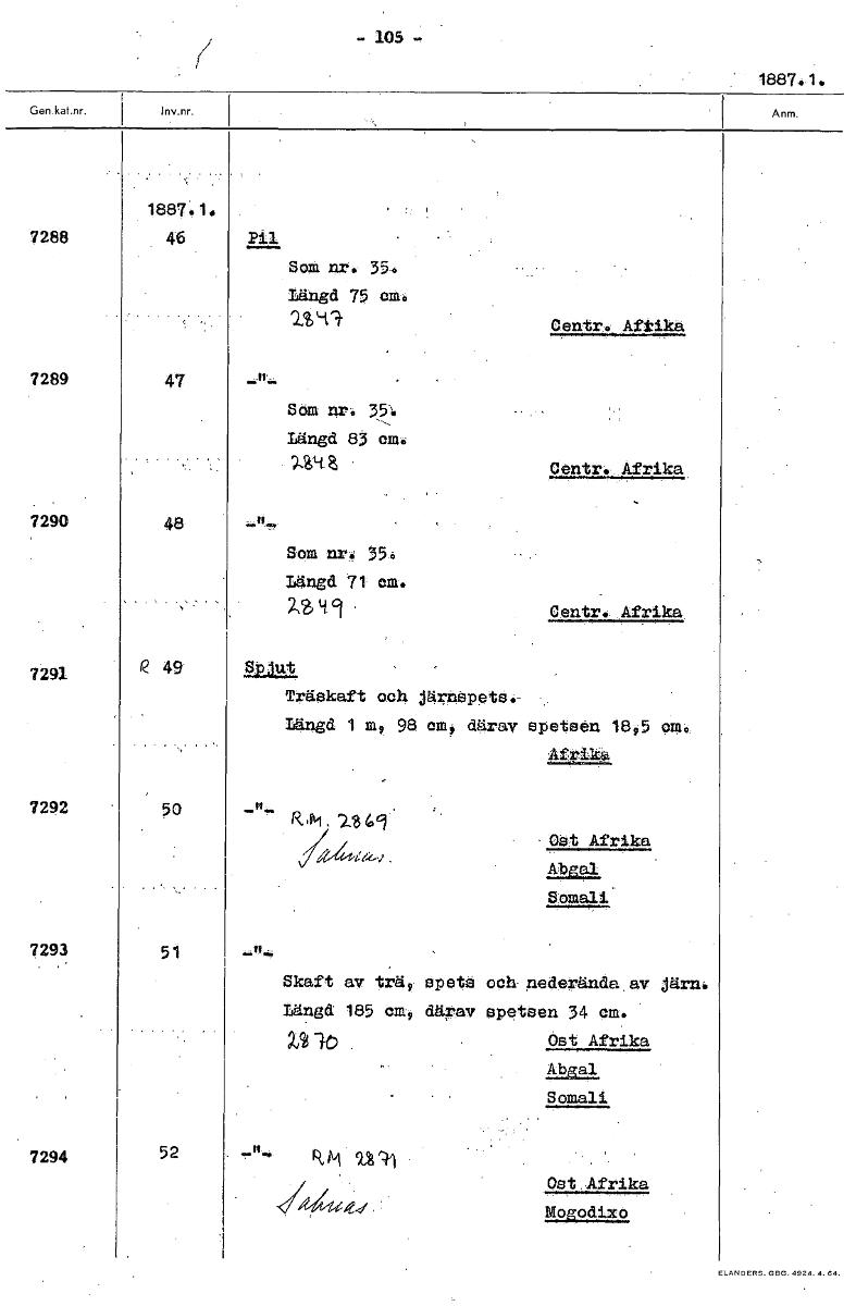 -105- 1887.1. 1 1887.1. 7288 46 Pil Sot nr. 35. längd 75 cm. Oentr. Afrika 7289 47 Som nr. 35:. Längd 83 em. Oentr.•Afrika 7290 48 Som nr. 35. Längd 71 cm. 2,S4.9 Oentr Afrika. 7291 49 Träskaft och jä...