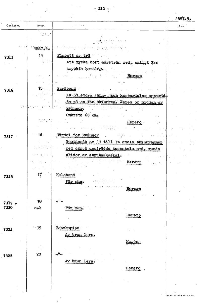 - 112 ' 1887-:54 48å7e.5' 7315 14 Pincett av. trä Att rYeka bart bårstrån med• enligt Blm trY014a Hererö 7316 15 Pärlband Av:61,.Stera.åärn.00b45APPAX_InAltIAKJAPAOkli : en.,fdann2t'es om mid an_ av kVinnorö trete.66 9r(19, Heret*, 7317 16 Gördel för. kvinner Bestående av_11 till 14 smala ekinnreramar med därpå uppträdda tusentals smt9.9.runda EikiVor:av struteätikale , Herero 7318 17 Halsbanol "n Pör. män. Herero 7 319 !. 18 7320 a,.4) För. män. Herero 7321 19 bakeioi a Av brun, lera. Herero 7322 20 Av brun lera, Herero [ocr]