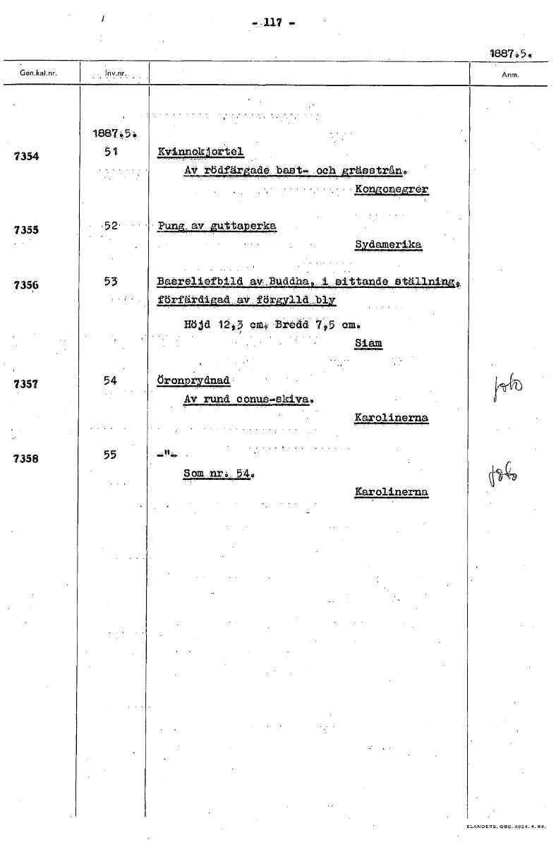 • .117 1867 G 7354 Kvinnokjortel Kon isanwg£ 7355 52 Pung, av guttaperka Sydamerika 7356 53 Basreliefbild av:Jhuddha. i sittande ställning0, förfärdigad aV.förgylld.blY Höjd 12s3 9m0 Bredd 105 mo Siam 7... Visa hela