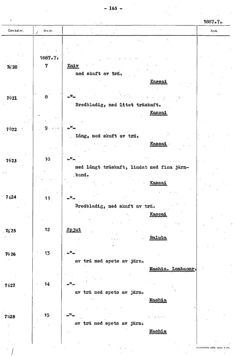 • - 165 - 18877!.- 1887.7. 7620 7 Kniv med skaft av trän Kassai 7621 8 -K» Bredbladige med litet träskaft. Kassa, 7622 • 9 Långe med skaft av trä', Kassa.i 7623 10 .0- med långt träskafte lindat med fin... Visa hela