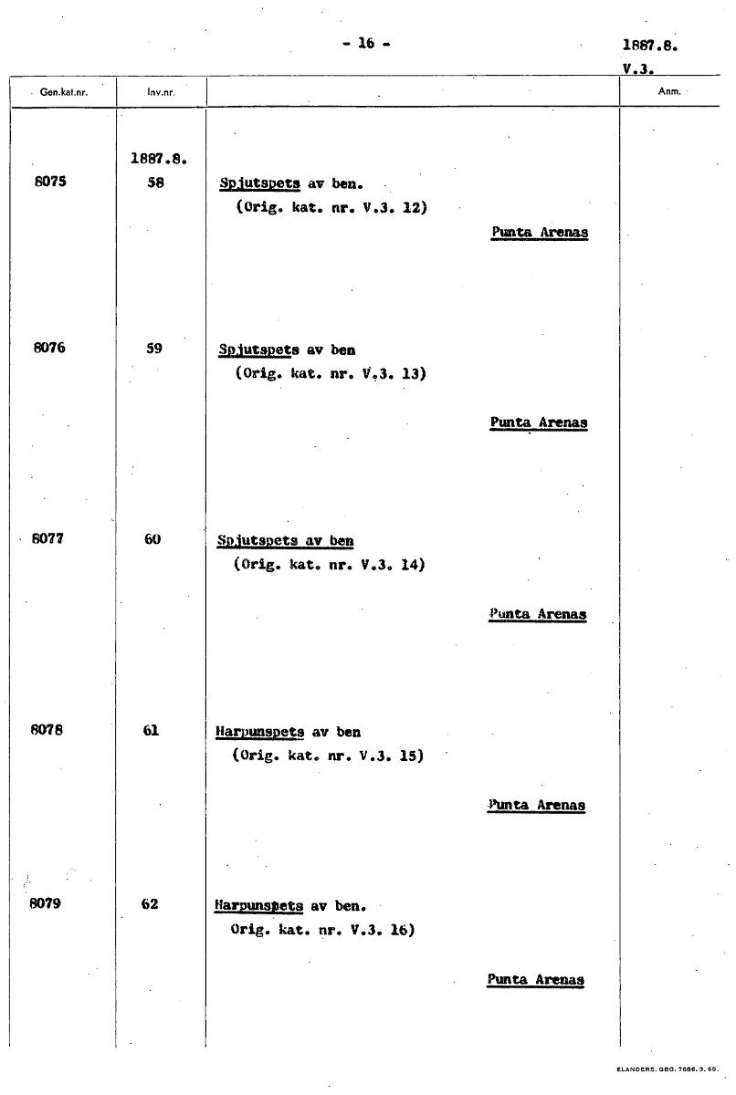 • - 16 - 1887.8. V.3. 1887.8. 8075 58 Spjutspets av ben. (Orig. kat. nr. V.3. 12) Punta Arenas 8076 59 Spjutspets av ben (Orig. kat. nr. V?3, 13) Punta Arenas 8077 60 Spjutspets av ben (Orig. kat. nr. V... Visa hela