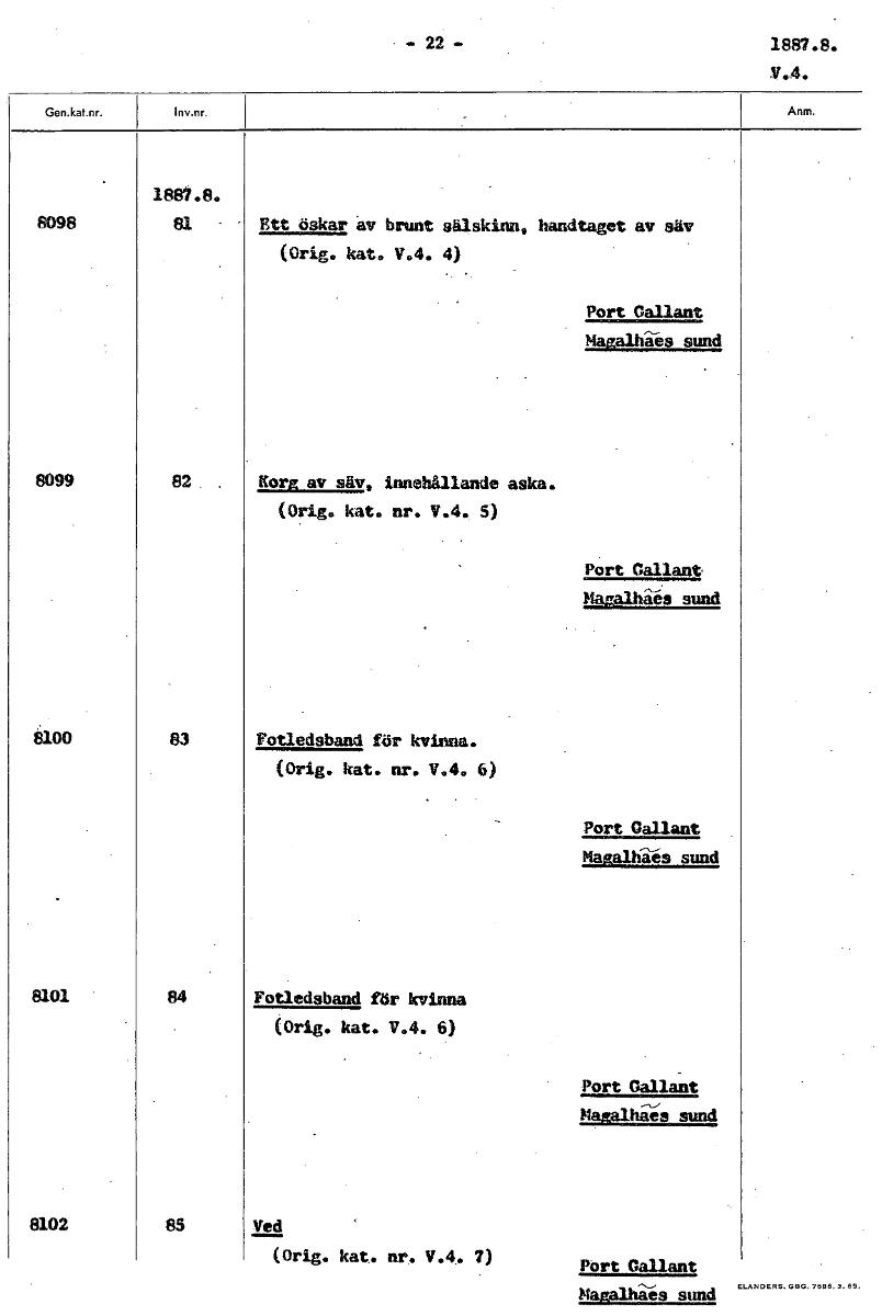• - 22 - 1887.8. V.4. 188? .8. 8098 81 Ett öskar 'av brunt sälskinn, handtaget av säv (Orig. kat. V.4. 4) Port Oallant Magalhäs sund 8099 82 , Rom av säv, innehållande aska. (Orig. kat. nr. V.4. 5) Port... Visa hela