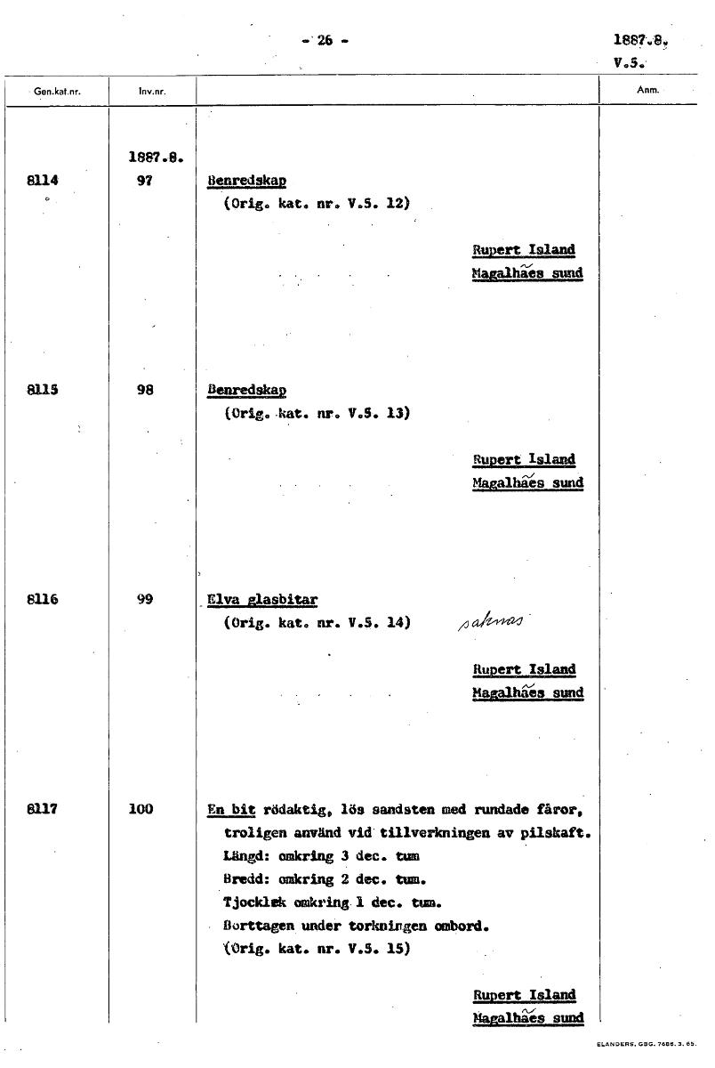 • -'26- 1887.8. 1887.8. 8114 97 Renredskap (Orig. kat. nr. V.S. 12) Rupert Island UågalbÄkIs sund 8115 98 Benredskap (Orig..kat. nr. V.S. 13) Rupert Island Magalhaes sund 8116 99 Elva glasbitar (Orig. k... Visa hela
