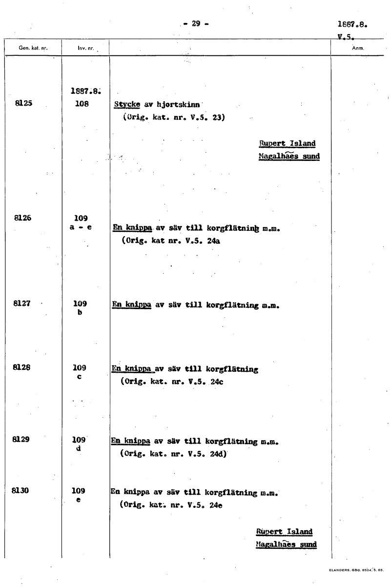 • -29- 1887.8. V.5 1887.8: 8125 108 Stycke av hjortskinn' (Orig. kat. nr. V.S. 23) Rupert Island tågalgis sund 8126 109 a - e En knippa av säv till korgflätninh (Orig. kat nr. V.S. 24a 8127 • 109 En kni... Visa hela