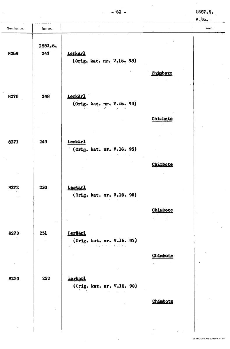• - 61 - 1887.8. V.16.. 1881.8. 8269 247 Lerkärl (Orig. kat. nr. V.16. 93) Chimbote 8270 248 Lerkärl (Orig. kat. nr. V.16. 94) Chimbote 8271 249 Lerkärl (Orig. kat. nr. V.16. 95) Chimbote 8272 250 Lerkä... Visa hela