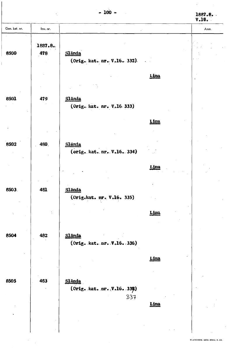 • - 100 - 1887.8. • V.18. 1887.8.. 8500 478 Slända (Orig.. kat.. nr.. V.16.. 332). • Liina 8501 479 Slända (Orig.. kat. nr. .V.16.333) Lima 8502 480, Slända (orig.. kat.. nr.. V.16.. 334) Lima. 8503. 48... Visa hela