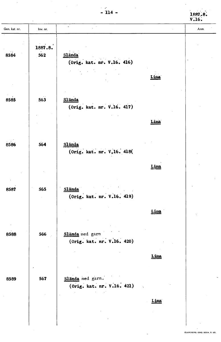 • - 114 - 1887..8. V.16. 1887.8. 8584 52 Slända (Orig. kat. nr. V.16. 416) Lima 8585 563 Slända (Orig. kat. nr. V.16. 417) Lima 8586 564 Slända (Orig. kat. nr. V,16: 418( Lima 8587 565 Slända (Orig. kat... Visa hela