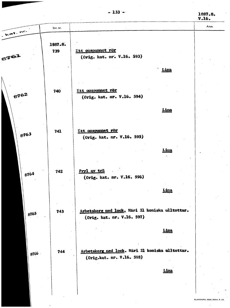 • -..133 - 1887.8. 11.16. 1887.8. 739 Ett omspunnet rör (Orig. kat. nr. V.16. 593) Lima 740 Ett omspunnet rör (Orig. kat. nr. V.16. 594) L 741 at omspunnet rör (Orig. kat. nr. V.16. 595) 742 12,21-Mtä (... Visa hela