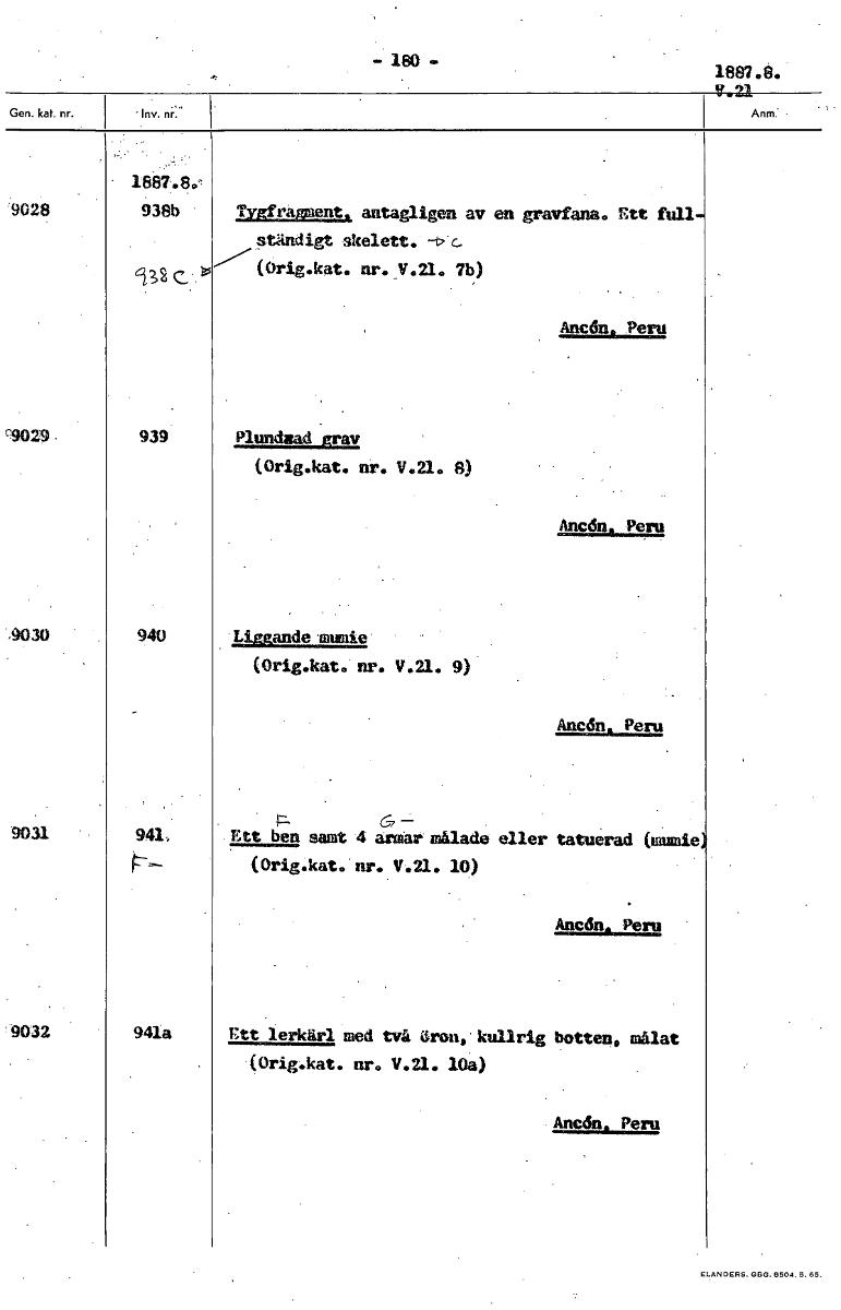 • - 180 - 1887.8. • 1887.8 9028 938b Tygfragolent., antagligen av en gravfana. Ett full ständigt skelett. -t>"c. i3% e nr. _V.21. 7b) ånedn. Peru • 9029 939 Plundsad grav (Orig.kat. nr. V.21. 8) hasgaig... Visa hela