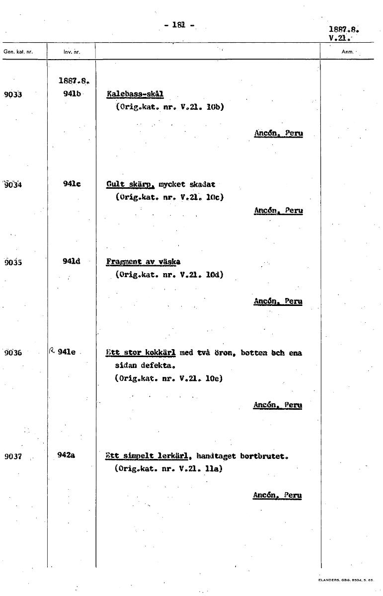 • - 181 - 1887.8. V.21.- 18f7,,g. 903'3 941b. Kalebass-skål (Orig.kat. nr. V.21. 10b) Aticdt?prm 9034 941c Gult skärp. mycket skadat (Orig.kat. nr. V.21. 10c) Peru Öds 941d Fragment av väska (Orig.kat. ... Visa hela