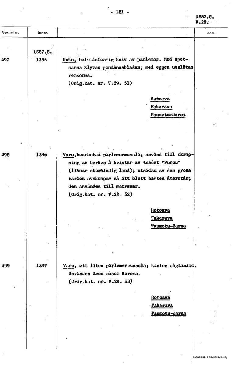 281 1887.8. V.29. 1887.8.. 497 1395 Kuku. balvmånformig,kntv,ay pärlemor.. Hed spat-. sarna klyvas pandanusbladen; med eggen utslätas remsorna., (Orig.kat. nr. V.29. 51) ------, otoava Pakarava Paumot...