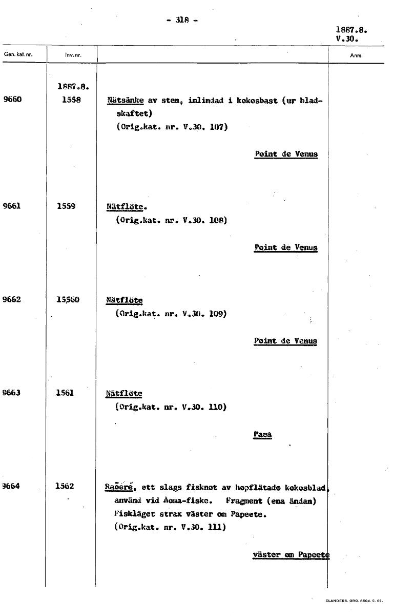 - 318 - 1887.8. V.30. 1887.A. 9660 1558 Nätsänke av sten, inlindad i kokosbast (ur blad- skaftet) (Orig.kat. nr. V.30. 107) Point de Venus 9661 1559 ~flöte. (Orig.kat. nr. V.30. 108) Point de Venus 9662 15,560 Nätflöte (Orig.kat. nr. V.30. 109) Point de Venus 9663 1561 Nätflöte (Orig.kat. nr. V.30. 110) pata 1664 1562 Raöere', ett slags fisknot av hopflätade kokosblad använd vid Aoma-fiske. Fragment (ena ändan) Fiskläget strax väster om Papeete. (Orig.kat. nr. V.30. 111) väster om Pa • ee [ocr]Stäng