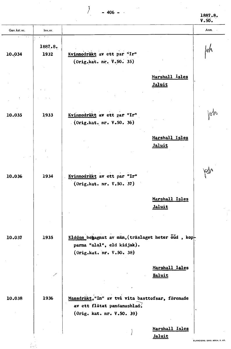 - 406 - 1887.8. V.50. 1887.8.. 10.034 1932 Kvinnodräkt av ett par "Ir" (Orig.kat. nr. 9.50. 35) Marshall Isles Jaluit 10.035 1933 Kvinnodräkt av ett par "Ir" (Orig.kat. nr. V.50. 36) Marshall Isles Jaluit 10.036 1934 Kvinnodräkt av ett par "Ir" (Orig.kat. nr. V.50. 37) Marshall Isles Jaluit 10.037 1935 Elddon beliagnat av män,(träslaget heter Ud , kop panna "alal", eld kidjak). (Orig.kat. nr. V.50. 38) Marshall Isles flaluit 10.038 1936 Mansdräkt,"In" av två vita basttofsar, förenade av ett flätat pandanusblacii. (Orig. kat. nr. V.50. 39) Marshall Isles 2 Jaluit [ocr]Stäng