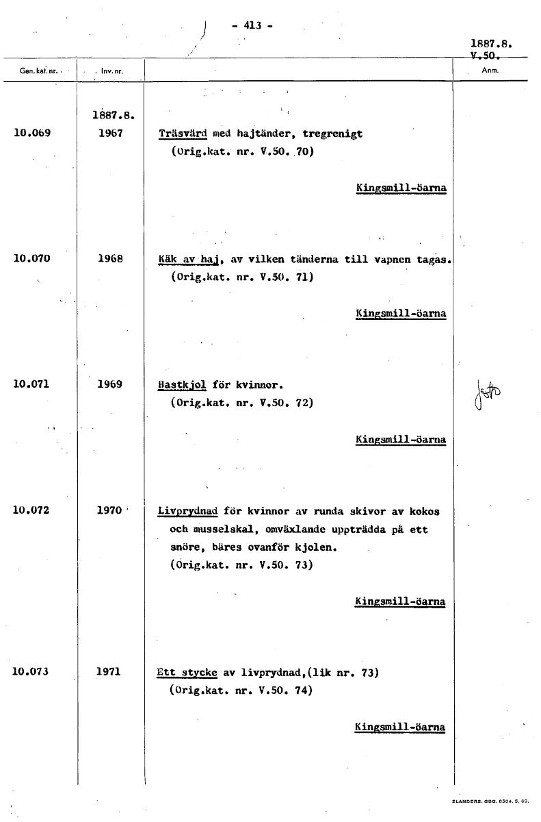 • - 413 - 1887.8. V_50_ 1887.8. 10.069 1967 Träsvärd med hajtänder, tregrenigt (Orig.kat. nr. V.50..70) Kingsmill -öarna 10.070 1968 Käk av haj, av vilken tänderna till vapnen tagas. (Orig.kat. nr. V.50... Visa hela