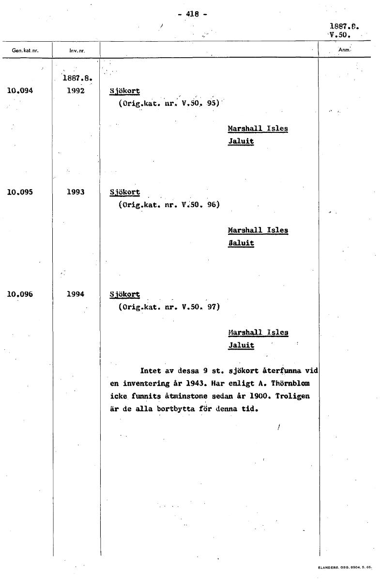 • - 418 - 1887.e. "V.50. • 1887.8. 10.094 1992 .Sjökort (Orig.kat. nr. V,50. 95)' Marshall Isles, Jaluit 10.095 1993 Sjökort (Orig.kat. nr. V.:50. 96) Marshall Isles ilaluit 10.096 1994 Sjökort (Orig.ka... Visa hela