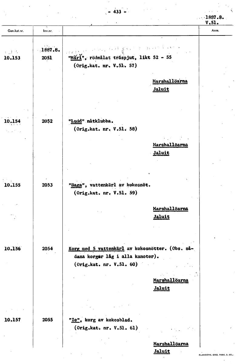 • - 433 .,1887.8. • V.51. 10.153 2051 "Märr" röd:Målat träspjut, likt 52 - (Orig.kat. nr. V.51. 57) Marshallöarna Jaluit 10.154 2052 "Ludd".nåtklUbba. (Orig.kat. nr. V.51. 58) Marshallöarna Jaluit 10.15... Visa hela